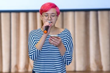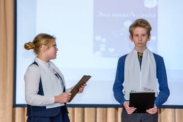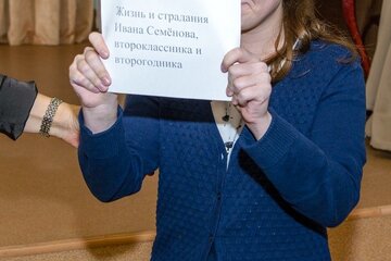«Чтобы узнать, что волнует автора, нужно просто прочитать его произведения», –продолжает ведущий. Начинаются публичные чтения фрагментов произведений Давыдычева. На экране – знакомая обложка книги с изображением стоящего на голове Ивана Семёнова, а на сцене – ученики «Мастерграда». Ребята читают. В зале – смех, что в очередной раз убеждает нас: писатель умеет весело рассказывать даже о серьёзных вещах.