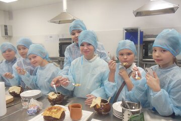 Дарья Федурина: Мы пробовали каши из перловки, морковки, муки, курицы и шампиньонов. Затем нам дали попробовать манный пудинг! Он был приготовлен из манной крупы и изюма, в него можно добавить апельсиновые чипсы, бананы в карамели и сироп. Но самое главное, что мы сами пробовали это приготовить! Такой урок у нас прошёл в рамках проекта «Кулинарная экспедиция». Совсем скоро нам предстоит приготовить кашу самостоятельно и выступить на кулинарном шоу.