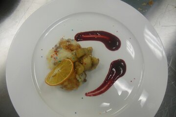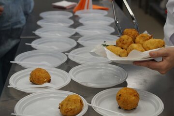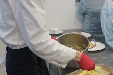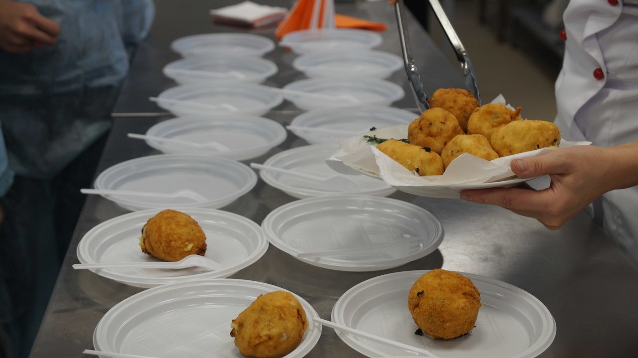 Прямо на наших глазах повара приготовили вкуснейшие крокеты из картофеля с грибным соусом. Золотистые поджаренные шарики пюре лежали на белоснежной тарелочке, рядом в соуснице – грибной соус, а украшены крокеты были поджаренной во фритюре петрушкой. Как же приготовить такую красоту? Все очень просто! Повар пояснила, что сначала необходимо скатать шарик из пюре (он может быть как просто пюре, так и с добавлением, например, грибов, кусочков и др.), окунуть его в яичный белок, в манку, снова в белок и, наконец, в сухари. Готовые шарики поместить по фритюрницу (при 170 градусах держать 5-7 минут), где они становятся румяными и хрустящими.