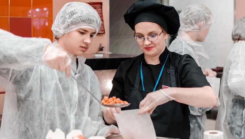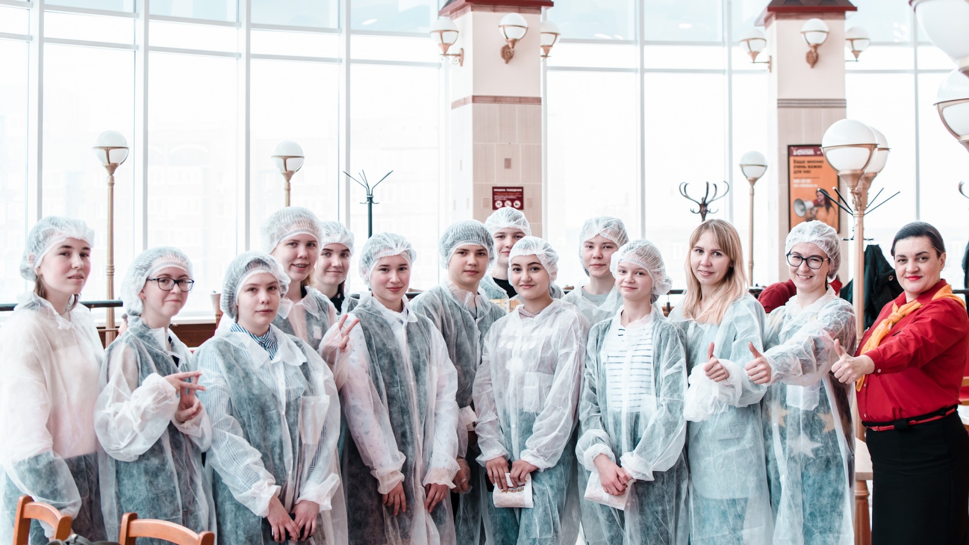 Также нам выдали халат, шапочки и бахилы, чтобы зайти в помещение кафе «Пельмешки да Вареники» (этот бренд был запущен в 2013 году). В целях безопасности нам провели небольшой инструктаж, и мы отправились на экскурсию.