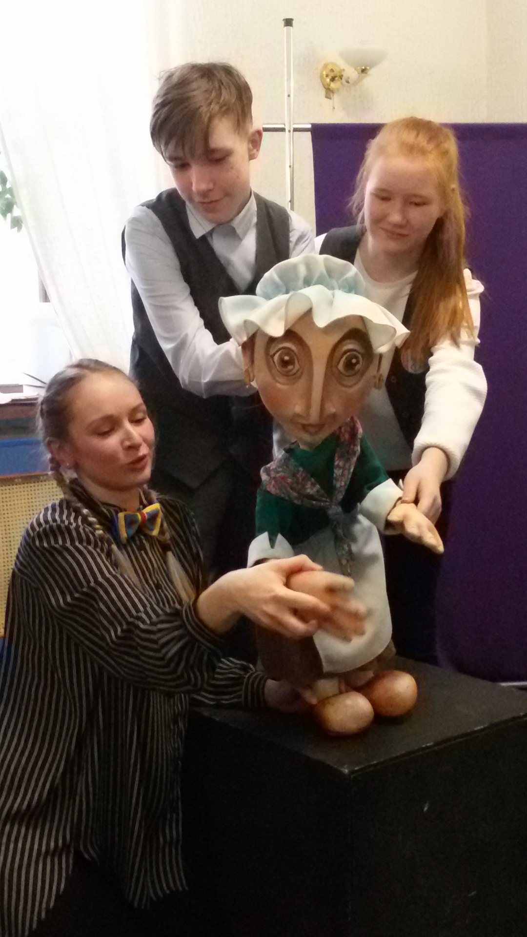 Наше представление о том, как в кукольном театре готовили спектакли для эвакуированных из Москвы и Ленинграда ребятишек, вполне сформировалось во время мастер-класса по работе с куклами. Мы вновь пришли в театр кукол. Нас встретила Беляева Алена, актриса театра, удивительно светлый и позитивный человек, настоящая волшебница. В ее руках оживали не только куклы, но и бумага, ткань, да и наши неподвижные пальцы и руки становились героями сюжетов.