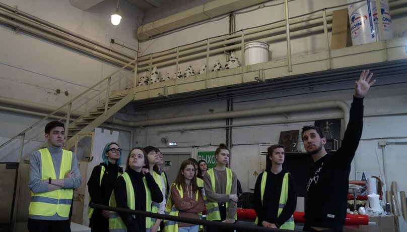 В «Театре-Театре» первым, что мы увидели, стала сцена «Молот». Здесь проходят показы новых и камерных постановок. Далее мы прошли в «Трюм» под главной сценой, где рассмотрели многочисленные механизмы и её устройство. «Раньше, чтобы поднять оркестровую яму на два уровня вверх, строились леса, это было долго и трудозатратно, а теперь механизмы регулируются лишь нажатием кнопки на пульте управления, а сцена поднимается на 12 различных уровней. Иногда мы почти не используем декорации, хватает только движения» — поделились с нами.