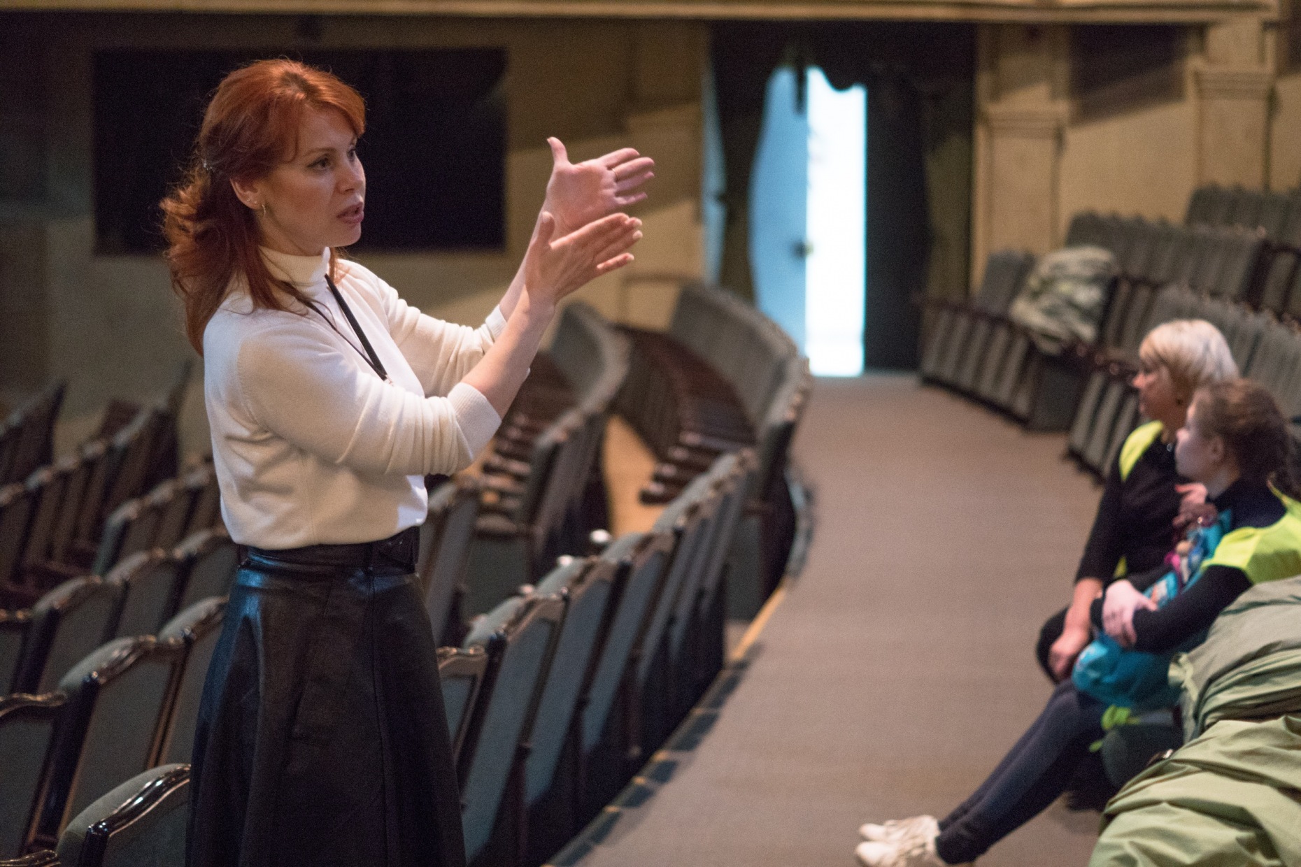 В оркестровой яме нам рассказали, что под ней при реставрации нашли стекло, оно нужно было для акустики, вот такую хитрость придумали основоположники театра! А ещё в оркестровой яме мы заметили «балкончики» — это бывшие ложи, в которых раньше, до реставрации театра, смотрели спектакли почётные зрители. Сегодня в них расположены осветительные приборы и небольшие «телевизоры» — мониторы, который помогают солистам и хористам вовремя вступать в свою партию.