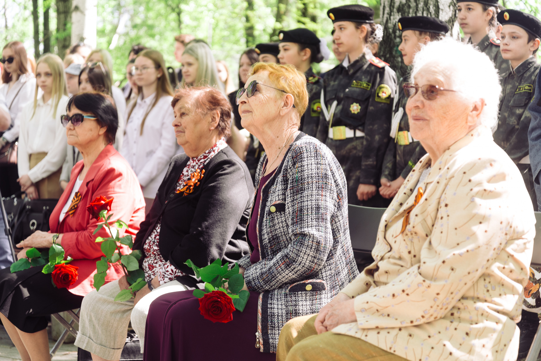 После приветствия стройным шагом в уютный полукруг из людей врывается оркестр учеников МАОУ «Школа бизнеса и предпринимательства»: на 10 минут известные всем мелодии военных лет разносятся ветром по всему саду им. В.Л. Миндовского.