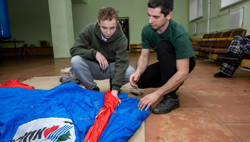 Ребята узнали о принципах работы парашюта, научились его собирать под руководством инструктора парашютно-пожарной группы Георгия Андреевича Роганина, а также смогли примерить защитную экипировку.