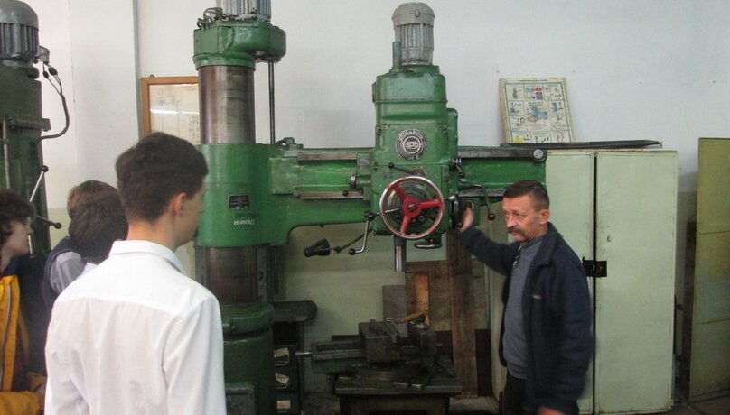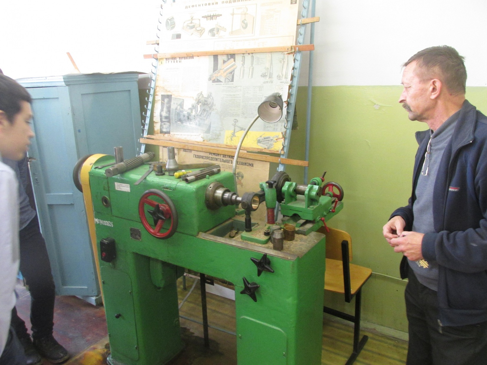 На втором этаже нас ждал преподаватель Валерий Александрович Мальцев. Нашу группу он провёл по мастерским. В мастерской электрооборудования мы увидели дефектоскоп – специальный прибор для поиска дефектов в механизме, станок для проверки двигателя, редкий станок для притирки клапанов и другие. В механической мастерской каких станков только нет! Вертикальный фрезерный, обычный токарный, горизонтальный фрезерный, строгальный, сверлильный, долбежный… Самое главное, Валерий Александрович включал нам каждый, чтобы показать: это не макет, а полноценный рабочий станок.