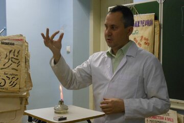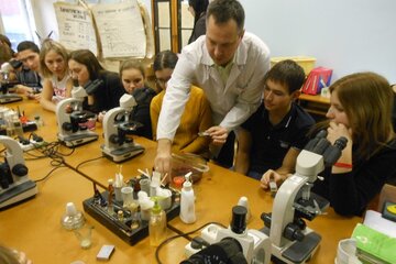 Дальше – лаборатория физиологии и биохимии растений. Её показывает факультетский Дамблдор – Дмитрий Валерьевич Кузякин – декан факультета, преподаватель и заведующий кафедрой ботаники, генетики, физиологии растений и биотехнологий. «Мы здесь занимаемся клонированием, – заявил Дмитрий Валерьевич, – но только растений». В лаборатории микробиологии ребята проводят эксперимент – простой фиксированный мазок из дрожжей. Юные биологи с любопытством разглядывают приборы. Берутся за дело. Эксперимент выполнен успешно.