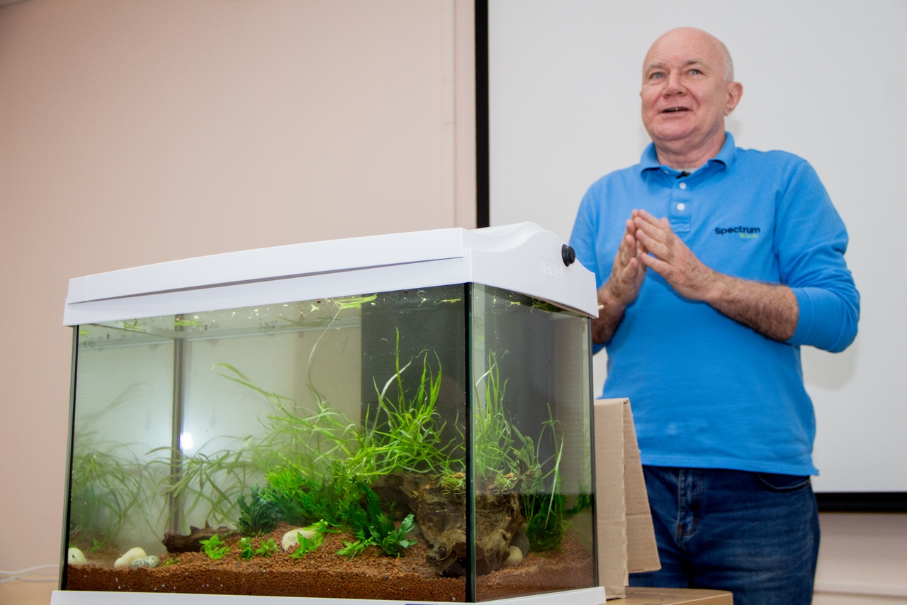Первая встреча в рамках проекта прошла в одной из аудиторий классического университета. Аквариумист с большим стажем, преподаватель обучающего центра Tetra-University Владимир Никитин прочитал ребятам лекцию о развитии аквариумистики, рассказал об особенностях и нюансах этого необычного искусства. Он сравнивает его с садоводством: «Аквариумистика с использованием живых растений сродни земледелию: время от времени мы подрезаем их, отбираем определённые культуры, применяем удобрения…»