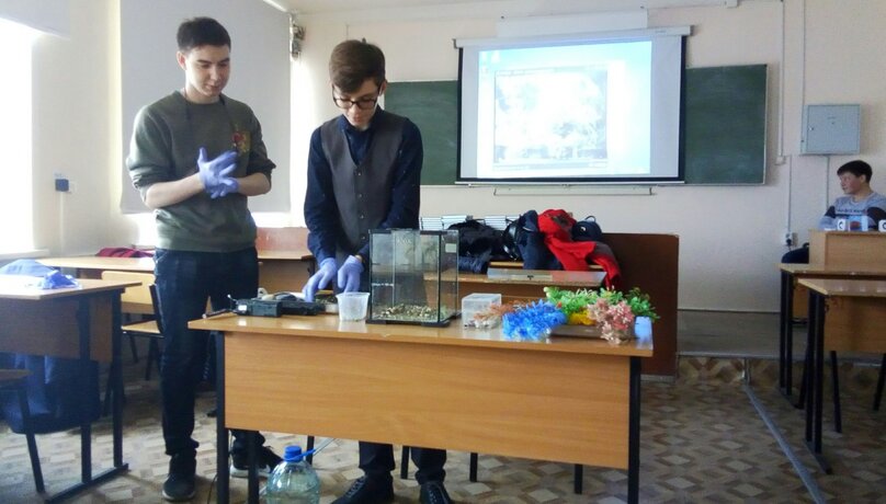 Здесь мы углубились в изучение аквариумистики. Студенты техникума рассказали нам о том, как ухаживать за рыбами в аквариуме.