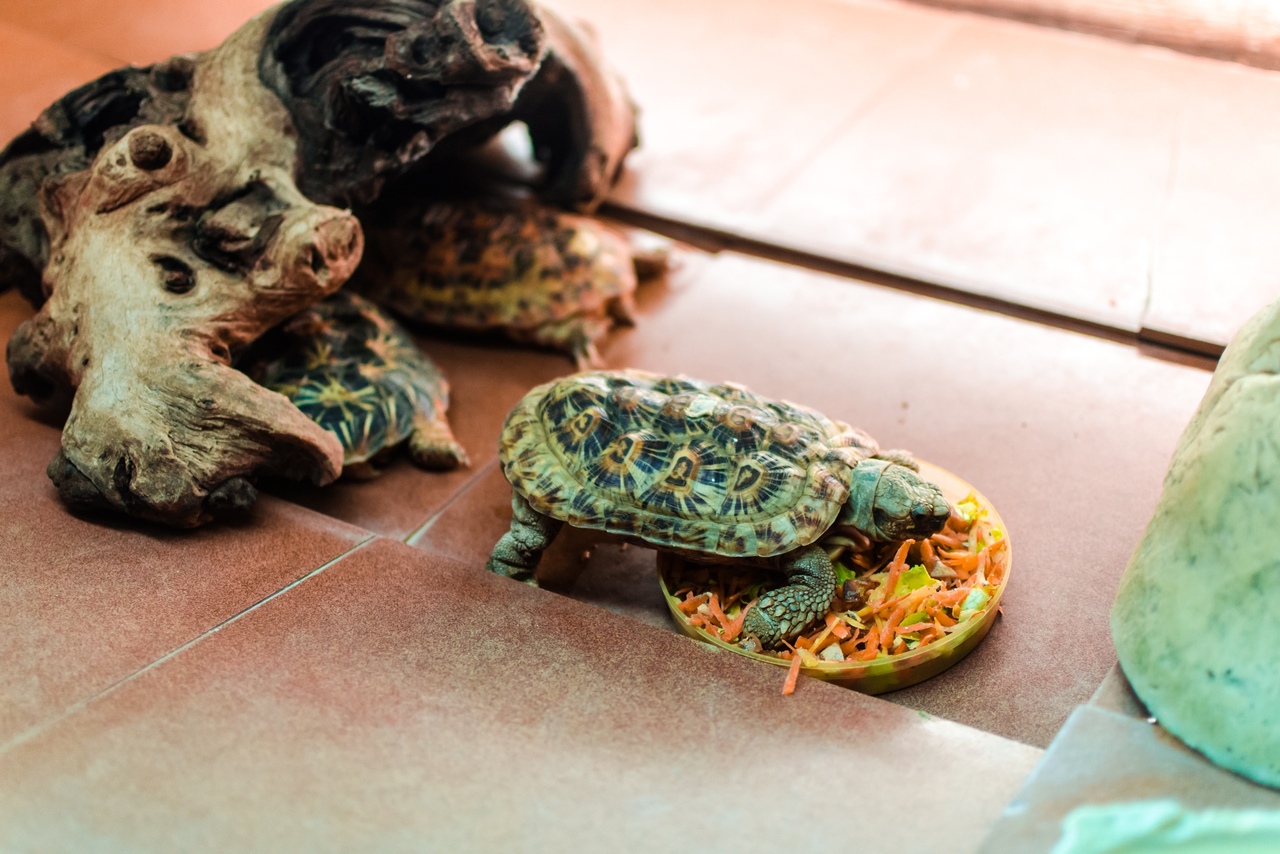 Затем нам предложили подняться на второй этаж. Там живут сухопутные рептилии: ящерицы, черепахи и хамелеоны. Мы остановились у каждого. Я лично заострил своё внимание на черепахе. Мне кажется, она хотела сбежать. Поднимала стекло и отпускала. Быть может, она тренировалась? Я не знаю. Но черепаха была великолепна! В аквариуме вместе с ней жили ещё две черепашки, но они просто лежали, смотря на неугомонную соседку.