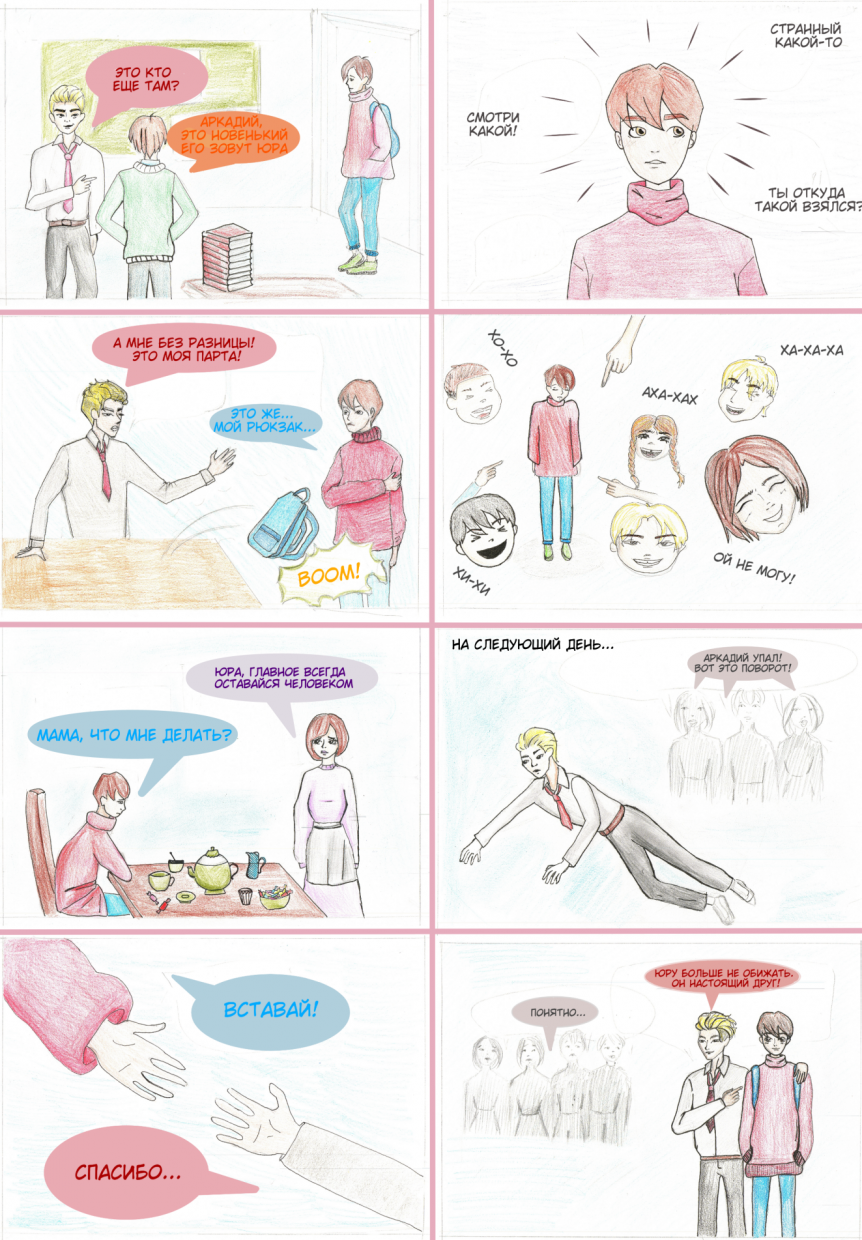Действие происходит в школе, где в начале года в класс заходит новый ученик Юра. Он сразу без причины становится предметом насмешек в новом классе. Больше всех «старается» главный задира – Аркадий. Но как-то раз он упал, и никто из его «друзей» ему не помог, а Юра протянул ему руку помощи, несмотря на то, что было. С тех пор они стали лучшими друзьями. Вот такой незамысловатый сюжет. Но этот комикс подтолкнул нас на идею проведения классных часов по этой теме ребятам с 4 по 7 класс. На классных часах можно обсудить то, как лучше влиться в новый коллектив и как действовать в подобной ситуации, показать, что в любой ситуации не нужно забывать про доброту, взаимопонимание и человечность.