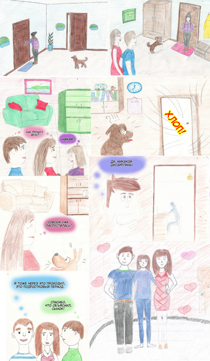 Привет! Меня зовут – Виктория, я представляю команду школы № 108, которая работала над созданием комикса «Взаимоотношения подростков и родителей».