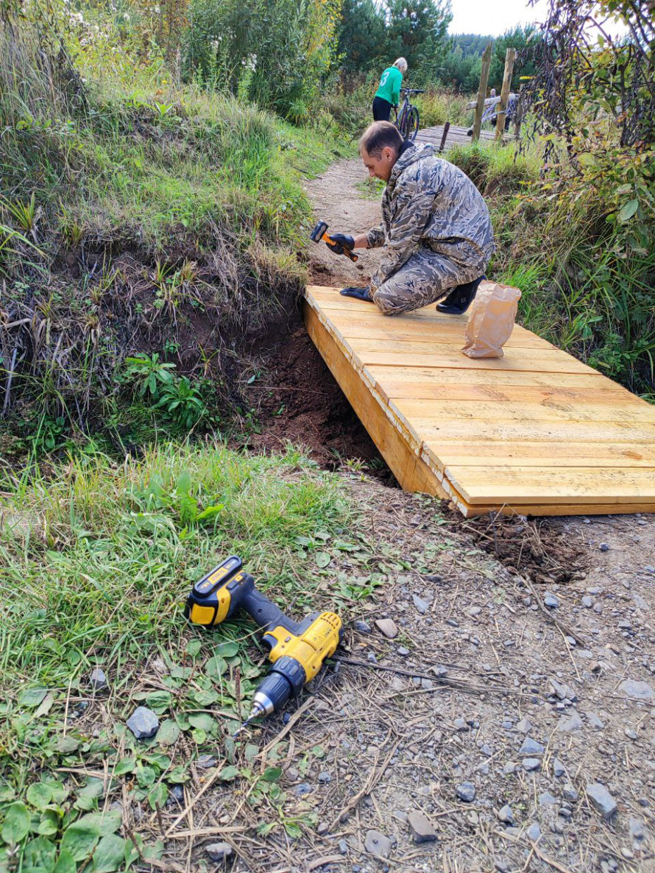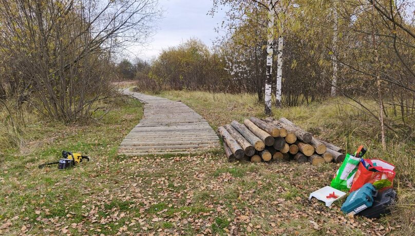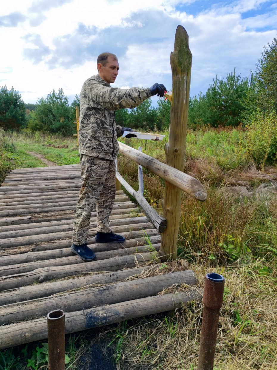 Работы по благоустройству, традиционно проводимые в августе и сентябре, в этом году были особенно масштабными. Они велись в рамках гранта Русского географического общества при организационной поддержке МКУ «ПермГорЛес». Под руководством инженера-эколога и при участии волонтёров был выполнен комплекс значительных работ. Были полностью обновлены дорожные конструкции: заменено более 20 прогнивших брёвен на дорожке через гайвинское болото. Также построены новые мосты: отремонтирован входной мостик и с нуля возведён удобный переход в дальней части тропы. Приведены в порядок малые архитектурные формы: дровенники, сцена, смотровая площадка. Все деревянные элементы обработаны защитной пропиткой для долговечности, а территория тропы очищена от мусора.