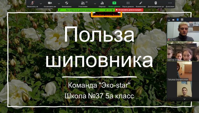 Доклад школы №27 был посвящён «Видовому разнообразию шиповника на экотропе». Юные участники команды «Эко-star» рассказали о способах приготовления напитков из этой ягоды, её пользе и вреде. Например, знали ли вы, что в плодах шиповника витамина C в 50 раз больше, чем в лимоне? Докладчики также призвали не обрывать плоды на экотропе, так как он нужен для изучения, а не для лакомства.