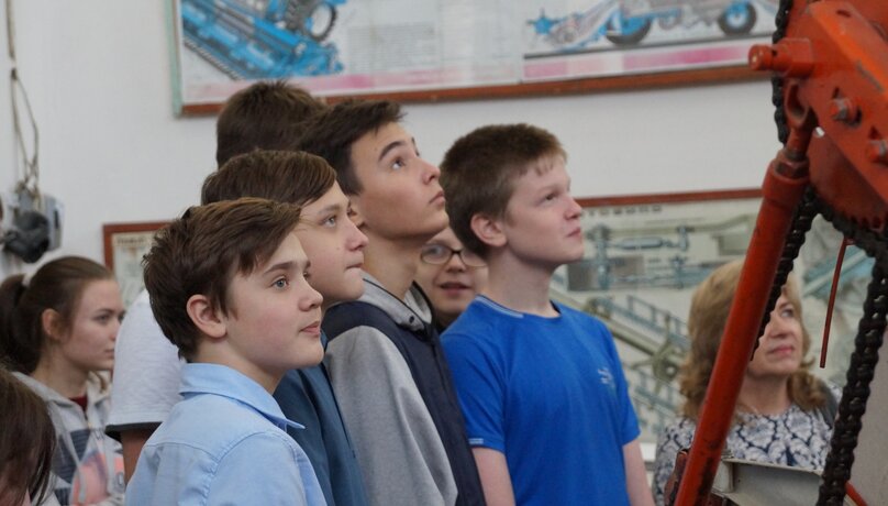 Когда мы приехали в университет, нас встретили и повели по длинному коридору и остановили у двери в большую и холодную аудиторию. В ней находился огромный красный зерноуборочный комбайн. В некоторых местах он был разобран, и мы смогли посмотреть на его «внутренности». А самые смелые даже залезли в кабину комбайна, покрутили руль и сделали пару фотографий на память.