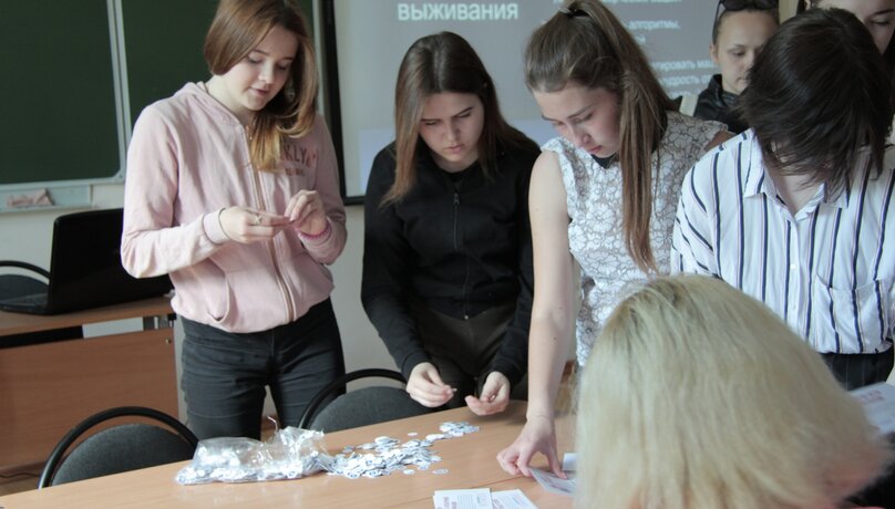 Затем настало время увлекательных игр. Одна игра была связана с передачей информации. Один человек информацию получает, передаёт её, как может, второму, второй – третьему. Третий говорит, что запомнил, а потом его ответ сравнивается с первоначальным сообщением. Девочки, участвовавшие в этой игре, справились с заданием хорошо. Вторая игра была наподобие лото. Только вместо карточек с числами предлагались карточки с будущими профессиями и их составляющими (необходимые школьные предметы, навыки и инструменты).