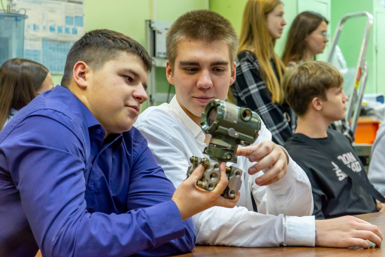 В лаборатории несколько стендов: настройка противоаварийной защиты, система контроля давления в ёмкости и другие. Лектор даёт ребятам потрогать и посмотреть датчики одного из оборудований.