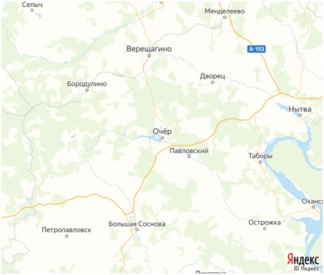 В исторической справке говорится: «Первые поселения людей на территории современного Очёрского района появились ещё в эпоху неолита, о чём свидетельствуют многочисленные археологические памятники, созданные ещё в период с пятого до первого тысячелетия до нашей эры. Более поздние находки свидетельствуют о том, что примерно с V по XIV века здесь не было постоянных поселений: эта территория была пограничной землёй между территорией родановского племенного союза и Волжской Булгарией. Заселение территории вдоль реки Очёр начинается в XVI-XVII веках».