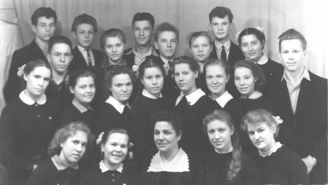 1-й ряд: Таня Гаврилова, Люба Новикова, Софья Иосифовна, Катя Мокрушина, Света Романенко; 2-й ряд: Оля Носкова, Надя Меньшикова, Вера Береснева, Ида Петроченкова, Тамара Попова, Люся Путина, Люся Наберухина, Миша Годовалов; 3-й ряд: Саша Вахрушев, Лёша Андрейченко, Коля Шадрин, Миля Химич, Гена Бакилин, Боря Агеев, Клава Каракулова, Володя Безукладников, я (Света Балашова).
