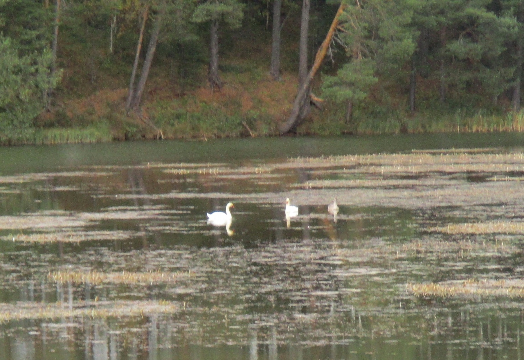 Бывали в этих местах и лебеди. Однажды удалось сфотографировать семейную пару с подростком-лебедёнком. Но они держались подальше от берега, охраняя малыша от возможной опасности.