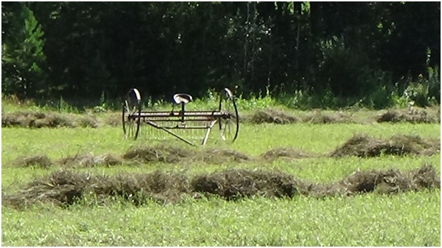 Конные грабли и сено в валках