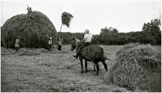 Как говорится, в копнах не сено. Завершающий полевой этап — метание стога. Правильно уложенное в стог сено — залог его сохранности на долгое время, иногда на несколько лет (если не «постригут» мыши). Это серьёзное, ответственное дело выполняли наиболее сильные и опытные. И вилы для этого были особые, трёхрогие, с длинным черенком, чтобы подавать сено на большую высоту. Если не было фабричных, делали деревянные вилы: вырезали из подобранного специально деревца с соответствующей развилкой ветвей. Использовались такие самодельные вилы годами, между сезонами хранились вместе с граблями, подоткнутыми где-нибудь под крышей сарая.