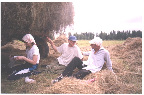 Обед на покосе. А. Н. Сальников помогает Печёркиным убрать сено