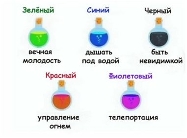 Поколдуем-помечтаем? Много веков алхимики, маги и ведьмы пытались создать эликсиры, которые бы сделали жизнь лучше. Если бы вы могли создать зелье, какое вы бы выбрали? Посмотрите внимательно на эти колбочки и подумайте, какими способностями вы бы хотели обладать?