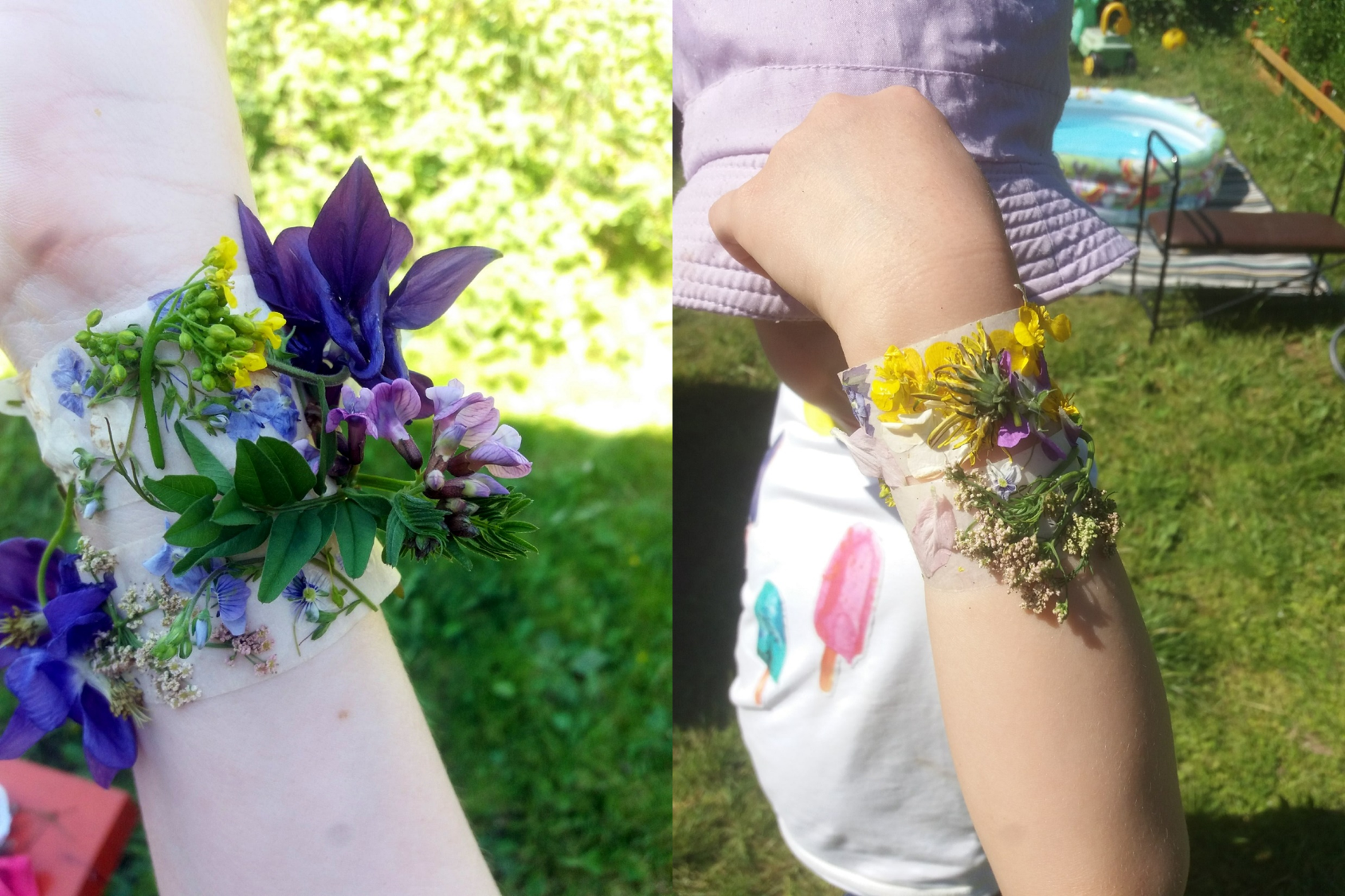 Это занятие увлечёт всё женское население вашего дачного домика! Вам потребуется любой скотч, лучше малярный. Обкрутите им разок своё запястье. Важно: клейкая сторона должна быть снаружи! Теперь отправляйтесь на прогулку в поисках красивых листочков и цветочков. Приклеивайте их к своим браслетам, хвастайтесь и восторгайтесь!
