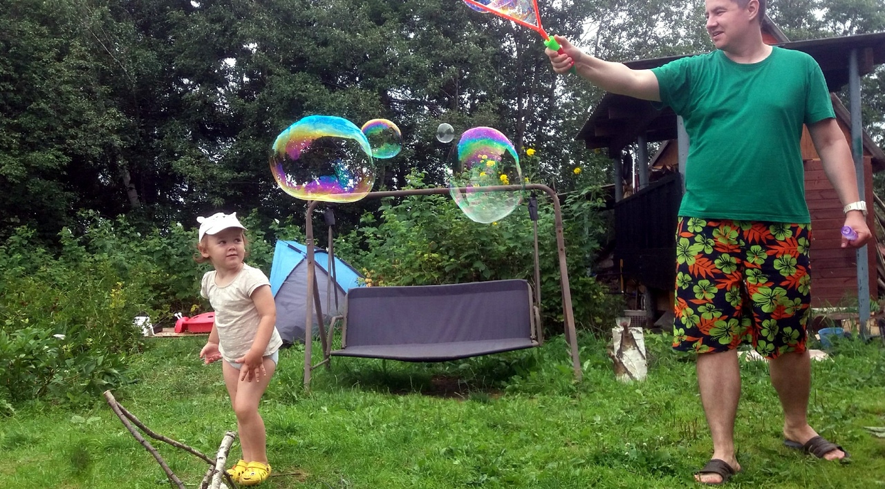 Шоу мыльных пузырей можно устроить не только по случаю дня рождения, но и просто так. Это действо вызывает визг у детей всех возрастов! Плюс того, что шоу устраивается на улице, в том, что от них не пострадает мебель, ковровое покрытие и суп; да ещё и ветер помогает раздувать огромные пузыри и уносит их высоко вверх! В интернете можно найти рецепт мыльного раствора, в книге «100 идей» — инструкцию, как сделать приспособление для гигантских пузырей. Но мы поступили проще: купили всё готовое в «Фикспрайс». Также у нас завалялись «мыльная» газонокосилка, пистолеты и перчатка — всё из «Детского мира». Получилось весело!