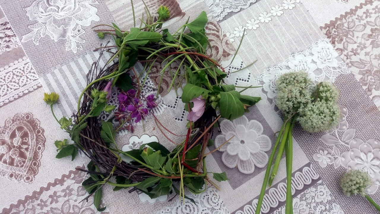 Венок — традиционное украшение, которое сначала можно носить на голове, а потом, когда наскучит, повесить на гвоздик. Только абы какой венок не сможет сохранить свой цвет и форму надолго, тут надо постараться. За основу возьмём классические для флористики тонкие берёзовые ветки: они отлично гнутся! Берём в руки пучок из таких веток, перекручиваем по спирали, а затем делаем из них кольцо. Укрепляем венок шпагатом или тонкой проволокой. Теперь добавим в венок цветов и ягод, которые потом, как высохнут, сохранят свою красоту. Это могут быть ягоды рябины, черноплодки, черёмухи… Их можно вплести в венок, аккуратно обмотав веточку с ягодами между березовыми прутиками. Теперь венок можно носить! А как надоест, сделайте петельку из шпагата и подвесьте венок на стенку в качестве декора.