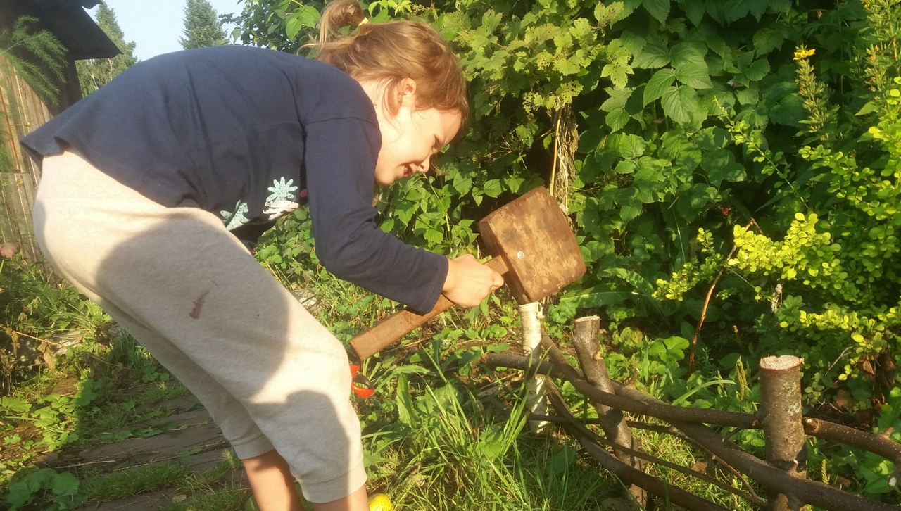 Тень-тень, потетень, / Выше города плетень. / Сели звери под плетень, / Похвалялися весь день — потешка, известная многим малышам. А что же такое плетень? Как тут объяснить, если не сплести вместе с детьми нечто подобное. Выберите местечко на даче, где есть необходимость в ограде, например, цветочную композицию. Плетень может быть сплетён как вдоль композиции, так и вокруг. Измерьте длину будущей изгороди и разделите её на 30, так вы получите нужное количество колышков. Мы замахнулись аж на 6,5 метров, поэтому пришлось напилить 22 колышка примерно 35 см высотой. Края колышков обточили клином, чтобы его было проще забивать в землю. Колышек нужно забить на глубину 10-15 см. Теперь идём на поиски горизонтальных жердей. Это должны быть прямые и легко гнущиеся ветки. На своей даче мы воспользовались ветками рябины и черёмухи длиной от 1,5 до 2 м, эксперты очень советуют иву. Мы счистили с них все листья и маленькие ответвления, чтобы получилась идеально ровная голая палка. Нам понадобилось порядка 30 таких веток. Техника плетня проста: нужно обвивать колышки змейкой. Если последний виток был за колышком, значит, следующую ветку расположите перед ним и идите дальше змейкой. Гибкие ветки легко поддаются детским ручкам: ребята оценят несложную технологию плетения, да еще и деревянным молоточком постучат (киянкой).