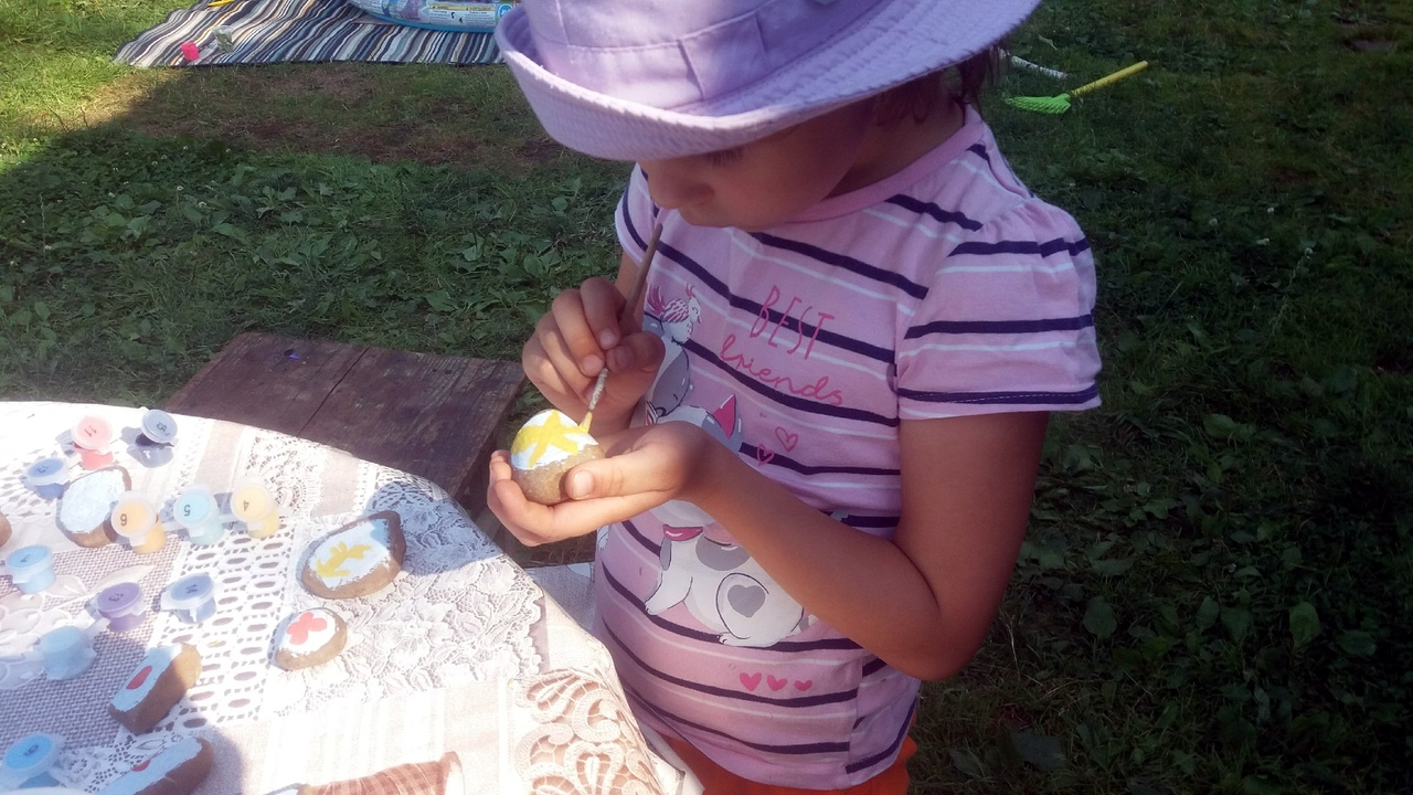 Будем учиться сочинять истории на ходу! На протяжении всей серии статей «Чем занять ребёнка на даче» речная галька была незаменимым материалом. В этом пункте она станет центральным элементом. Нам снова понадобятся акриловые краски. Найдите более-менее плоские камни, чтобы на них было удобнее рисовать. Нанесите на камушки фоновую краску: белую, серую или светло-голубую. Теперь нужно нарисовать на каждой гальке что-то одно: цветок, птичку, лягушку, жука, козу, ведро, кружку — что угодно! Теперь надо дать рисункам высохнуть. Затем кладём камни в непрозрачный мешок (или чистый носок). Первый участник вытягивает камушек и придумывает начало истории с употреблением того, что было изображено на гальке. Следующий участник должен продолжить историю с использованием изображения на следующем вытянутом камне. Не обязательно ограничивать участников одним предложением, они могут придумать небольшой сюжет вокруг вытянутого «героя».