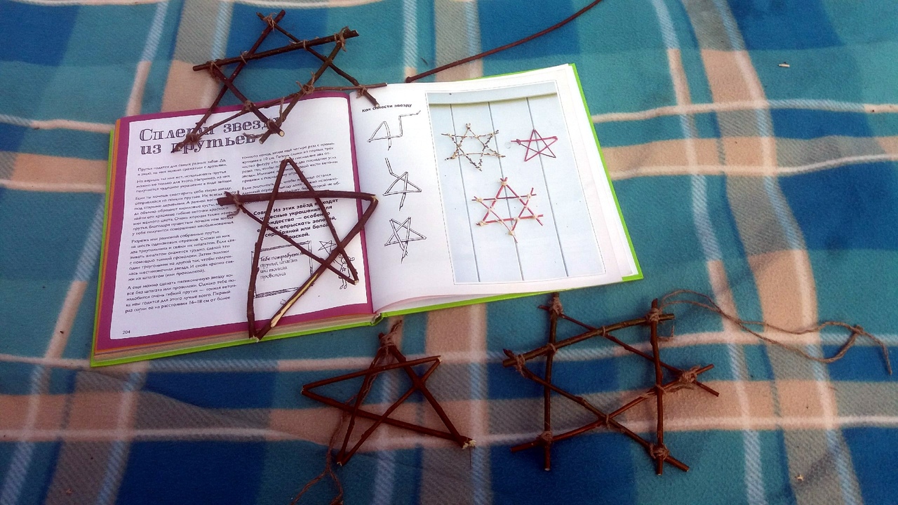 Продолжаем тему украшательств. Если вы взялись делать плетень, значит, у вас во дворе осталось много гибких веточек рябины и черёмухи длиной 40-60 см. То, что надо! Предлагаем попробовать сплести пяти- и шестиконечные звёзды. Для этого вам понадобится шпагат и ножницы. Чтобы сделать пятиконечную звезду, возьмите ровную ветку и надломите её в пяти точках. На фото к этому пункту вы увидите иллюстрации, как именно её нужно складывать — такая инструкция проще словесной. А вот, как делается шестиконечная звезда. Нужно разрезать имеющиеся у вас ветки так, чтобы получилось шесть одинаковых по длине кусочков. Теперь сплетите три кусочка треугольником, закрепляя уголки шпагатом. То же самое нужно проделать с оставшимися тремя палочками. Теперь наложите два треугольника друг на друга так, чтобы получилась звезда, и зафиксируйте шпагатом места пересечений веток. Также на одной из вершин фигуры можно сделать петельку, чтобы было легче повесить на гвоздик.