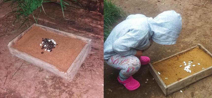 Жизнь на даче не прекращается даже ночью. Книга «100 идей для детей во дворе» предлагает узнать, кто бродит по участку, пока вы спите. Нет, она не призывает ставить капкан, речь идёт о песочной ловушке. Нужно взять старый противень (за его неимением я брала невысокий деревянный ящик) и наполнить его влажным песком вровень со стенками. Поверхность песка нужно разгладить линейкой или совком. Посреди противня кладём приманку, например, собачий или кошачий корм, семечки тыквы, подсолнечника, подсушенный хлеб. Оставляем ловушку рядом с брёвнами или забором, ложимся спать. Наутро проверяем ловушку, съедена ли приманка? Отпечатались ли следы? Если да, внимательно рассмотрите следы и поищите в интернете ответы, кому они могут принадлежать. Хоть мы и надеялись увидеть следы ежика или белки (уж не лисы и волка, конечно), на песке оказались лишь следы кошачьих лап и «тычки» от птичьего клюва. Автор книги советует не отчаиваться и расставлять такую ловушку в разных местах: вдруг получится поймать уникальный след!