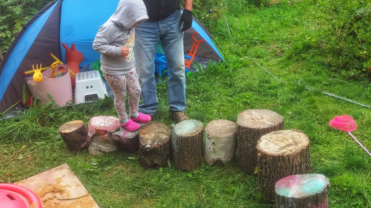Любой пенёк рассматривается ребёнком как вызов. А уж если перед ним выстраивается целая вереница, тут ему совсем сложно держать себя в руках! Может, на участке лежит поваленное дерево? Поскорее расправьтесь с ним! Заготовьте пеньки разной высоты: от 20 до 40 см. Сделайте из них тропинку на возвышение и снижение. Позаботьтесь о том, чтобы пни были устойчивыми. Позже эта конструкция может стать амфитеатром при театральных выступлениях детей, носом корабля и вообще чем угодно!