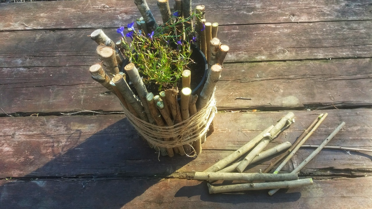 На вашей даче наверняка есть несколько пластиковых цветочных горшков от рассады, давайте их украсим... палками! Дети в этом деле большие помощники: они с лёгкостью могут подобрать под деревьями более-менее прямые и ровные палки. Если подходящих сухих палок нет, обстригите ветки сирени, рябины или ивы — они наверняка отбрасывали тень на огород. Теперь нужно подготовить достаточное количество палочек длиной выше горшка. Сухие палки можно поломать вручную, а срезанные — секатором, это дело лучше поручить взрослым. Теперь нацепите на цветочный горшок пару канцелярских резинок и просуньте в них палочки. Как только они закроют всю длину стенки, обвяжите горшок шпагатом или проволокой. постоянно подтягивайте шпагат и смыкайте палочки ближе друг к другу, чтобы они буквально сцепились. Внутрь горшка можно посадить что угодно. Я пересадила "грустную" лобелию, чтобы она набралась сил и снова стала кудрявой. Автор книги "100 идей для детей во дворе" советует посадить в горшок осенью цветочную луковицу и оставить на зиму на улице, чтобы весной появился цветок.