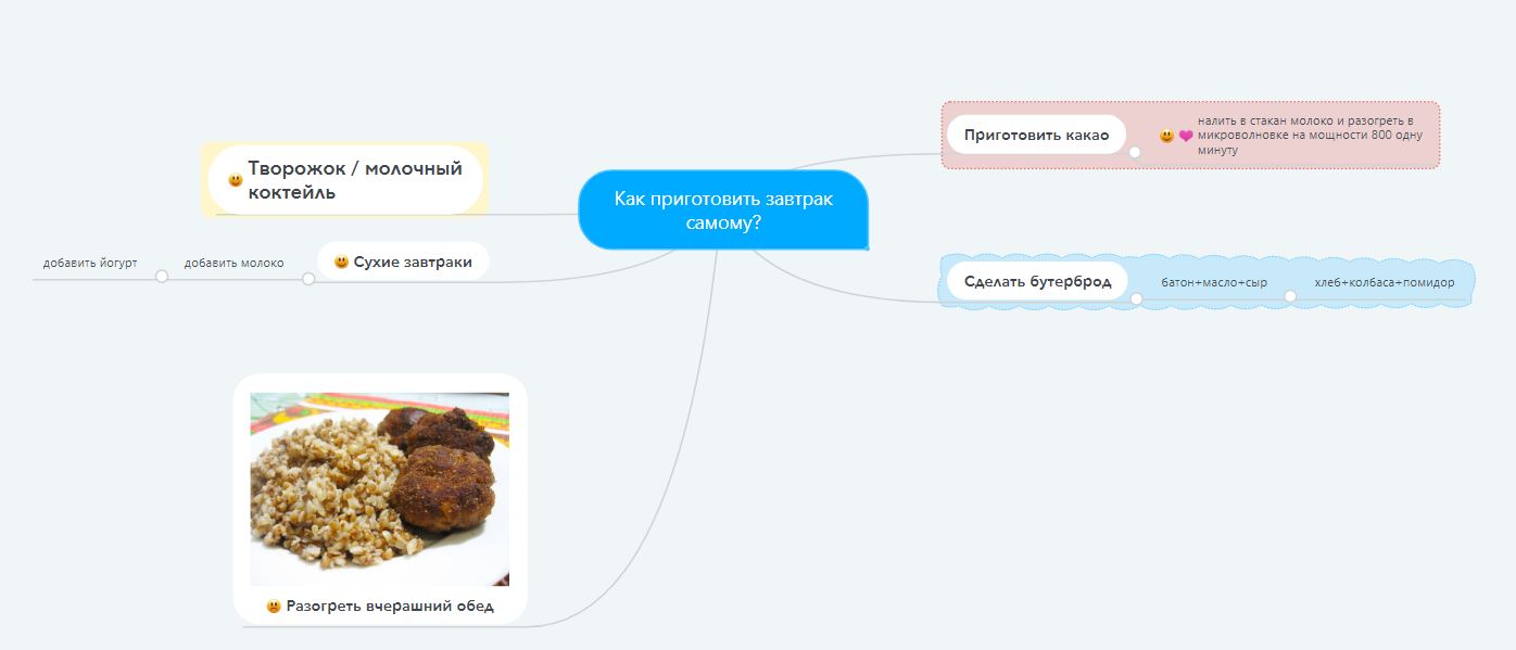 Это такой визуальный способ отражения индивидуального хода мыслей. С её помощью первоклашке будет легче представить варианты решения проблемы. Например, как быстрее собираться в школу или делать домашнее задание. В центре листа записываем проблему: как самому сделать себе завтрак? Обводим её в овал или прямоугольник. Обсудите варианты: развести какао в молоке; сделать бутерброд; съесть творожок или йогурт; смешать с молоком сухие завтраки; разогреть вчерашний обед… Если ребёнок предлагает нереальные на ваш взгляд варианты, не критикуйте их, записывайте, обсудите целесообразность эскимо на завтрак в конце мозгового штурма. Выпишите на интеллект-карту понравившиеся вам обоим варианты вокруг главного вопроса. Далее вокруг каждого пункта мы можем добавить что-то важное. Например, накидать варианты простых рецептов бутербродов, с чем можно смешать сухой завтрак, сколько нужно греть молоко в микроволновке. Эта информация располагается вокруг пункта. Карту обязательно нужно оформить иллюстрациями, картинками, вырезками, наклейками, чтобы она притягивала взгляд. Карту можно делать в бумажном или цифровом варианте, используя специальные приложения.