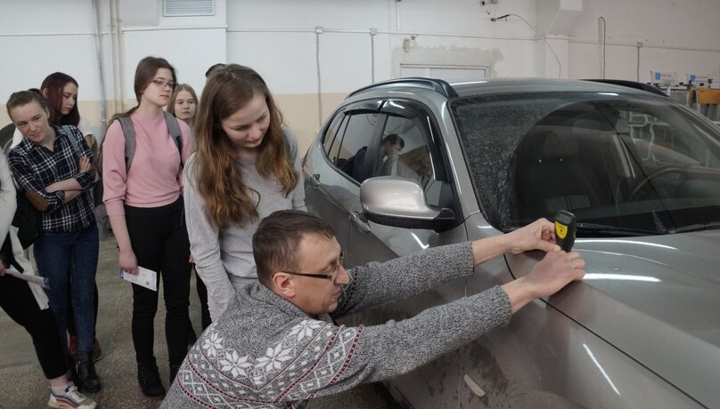 Ещё мы ходили в автомастерскую, где преподаватель техникума Анатолий Александрович Соловьёв рассказал о работе с двигателем и о том, как безопасно поменять колесо. Там же нас встретил Максим Сергеевич Лукашин, представитель компании «Грант Авто». Он рассказал, что надо знать при выборе автомобиля: марку, пробег, состояние кузова и много другое. По словам специалиста, не менее важно выяснить, была ли машина перекрашена, попадала ли в ДТП и т.д. Максим Сергеевич научил нас с помощью специального прибора проводить замер толщины краски на автомобиле. На случай, чтобы нас не обманули при покупке. Затем мы узнали, как проверить качество масла в автомобиле и как заменить его при необходимости.