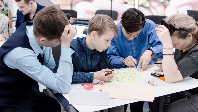 После выступления ребята приступили к практической части – созданию концепции виртуальной экскурсии для потенциальных сотрудников компании VERRA. Ребята постарались на славу: со стороны они выглядели как рой самых активных на свете пчёл, орудующих фломастерами, цветной бумагой и клеем. Ребята постарались использовать все наработки, которые с ними обсуждали спикеры, и даже больше: в ход пошли идеи съёмок с квадрокоптера с интеграцией на сайт, визуализированные на ватмане модели кликабельных макетов и ссылок, нарисованные от руки логотипы Toyota, Porsche и Lexus и т.д.