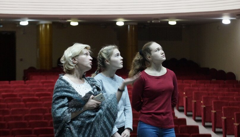 Он рассказал о запланированных концертах и привёл нас на выставку юных архитекторов, где мы могли проголосовать за понравившиеся работы. А затем мы оказались в самом главном месте Дворца культуры – на сцене. Мы увидели механизм занавеса и круговой механизм сцены, побывали за кулисами.