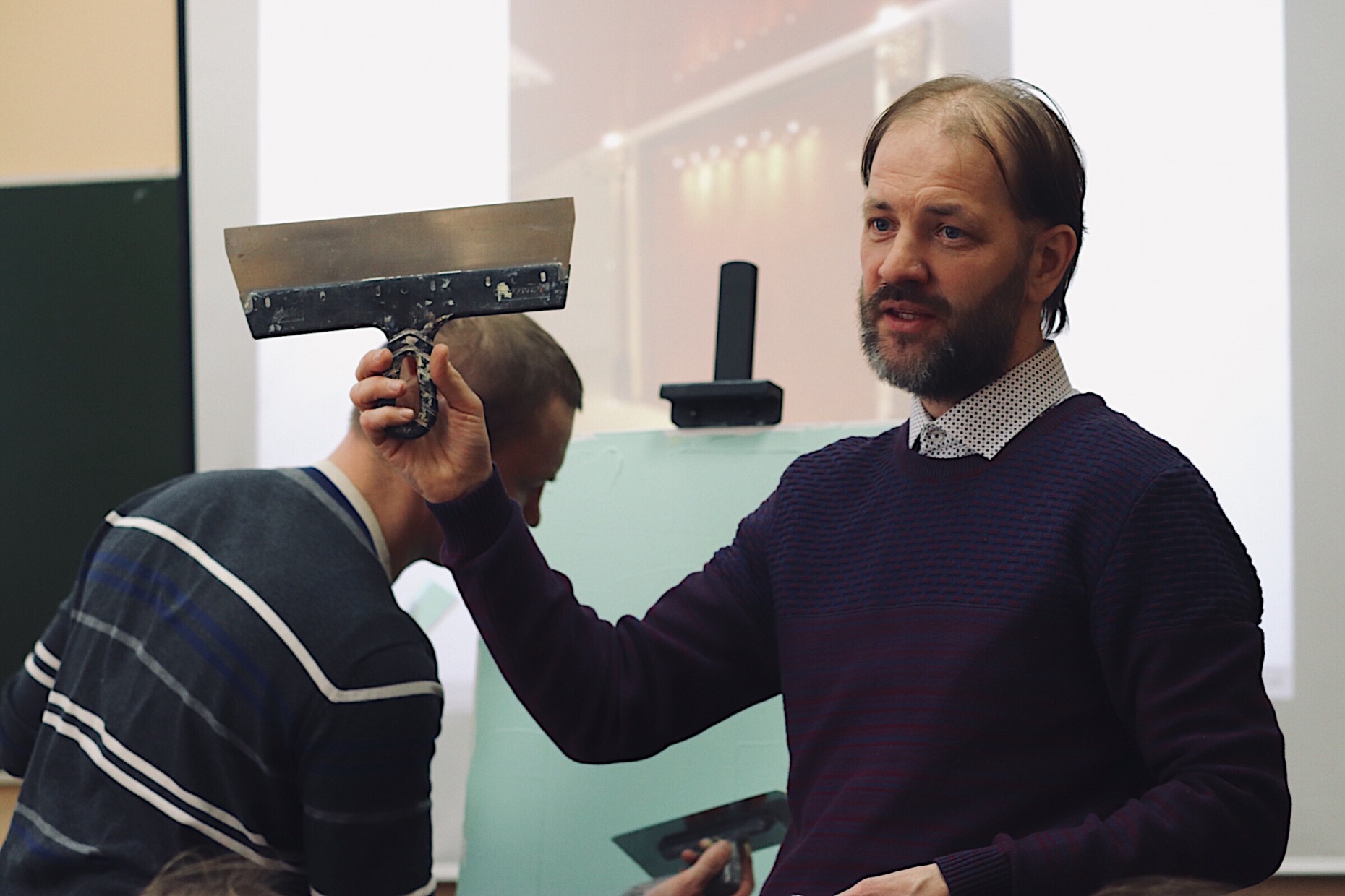 Сразу же после официальной части состоялся первый мастер-класс по нанесению покрытий на панно от Алексея Бородина. Он рассказал о профессии мастера-декоратора, трудностях и интересных моментах в работе. «Мы – элитные войска штукатурщиков-маляров, берущих шпатель, валик и кисть, чтобы сотворить красоту», – так описал свою профессию Алексей. Мастер утверждает, что практика намного важнее теории и реальное обучение декоратор проходит непосредственно на объекте. Кроме того, Алексей рассказал о материалах, необходимых для работы, красках и различных техниках исполнения, а также показал готовые эффекты.