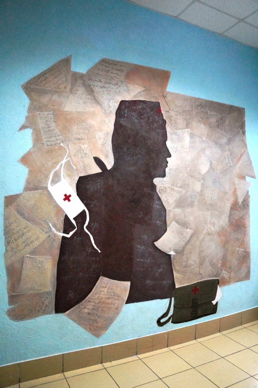 На арт-панно изображены врач и школьница. Как известно, в годы войны дети приходили в эвакогоспитали и помогали раненым солдатам. В открытом окне показана жизнь без войны, надежда на светлое будущее. А из окна летят письма, которые писали солдаты домой. Всего на нанесение рисунка у нас ушло три дня. Иногда возникали трудности: например, было тяжело выравнивать поверхность. Но зато работать с красками понравилось всем!