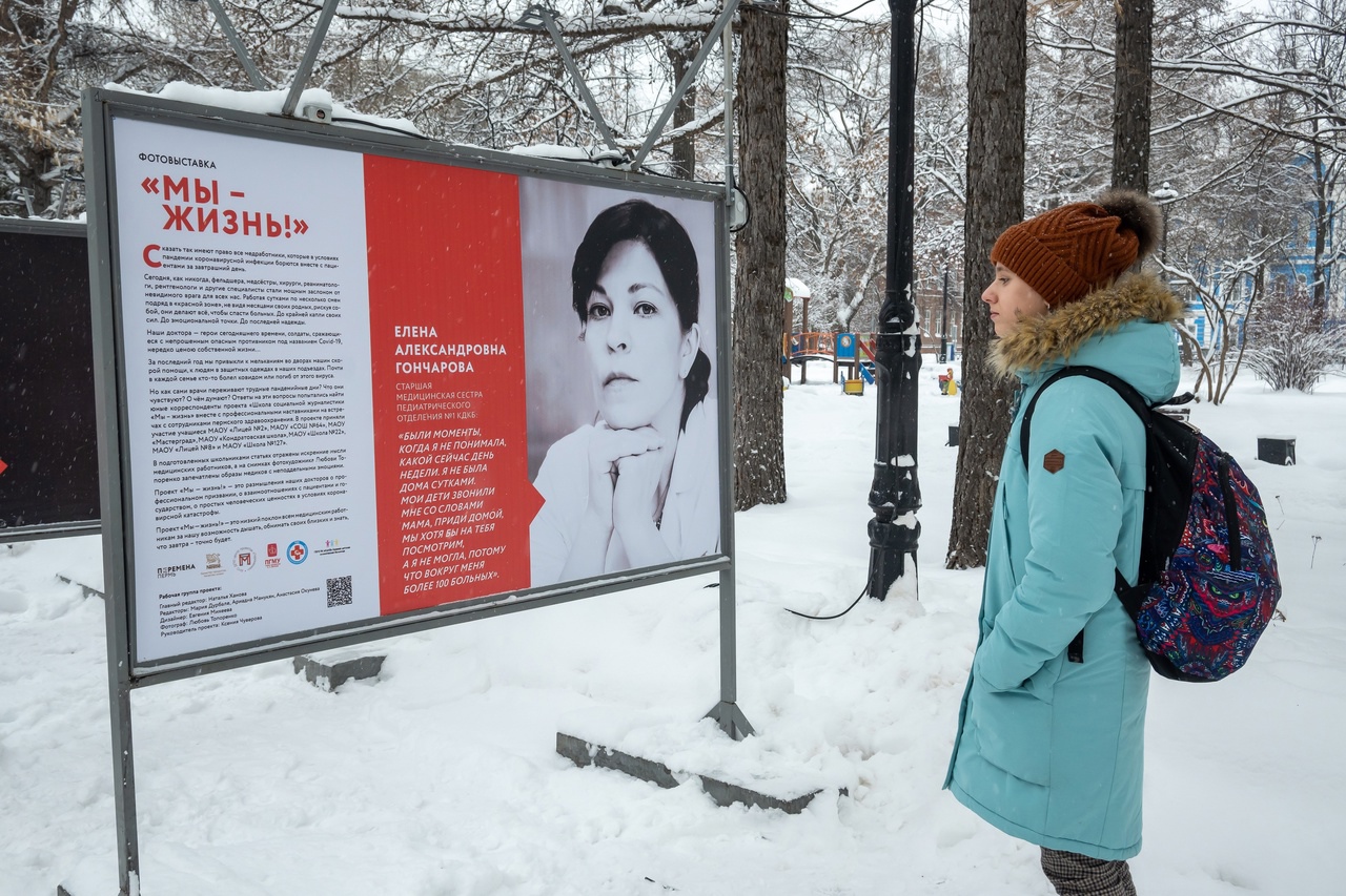 Сама выставка, открывшаяся 22 декабря, уютно расположилась в сквере возле театра оперы и балета им П.И. Чайковского и будет проходить до апреля 2022 года. Каждый посетитель выставки может отсканировать QR-код на приветственном стенде и познакомиться с полными версиями созданных школьниками очерков о медицинских работниках.