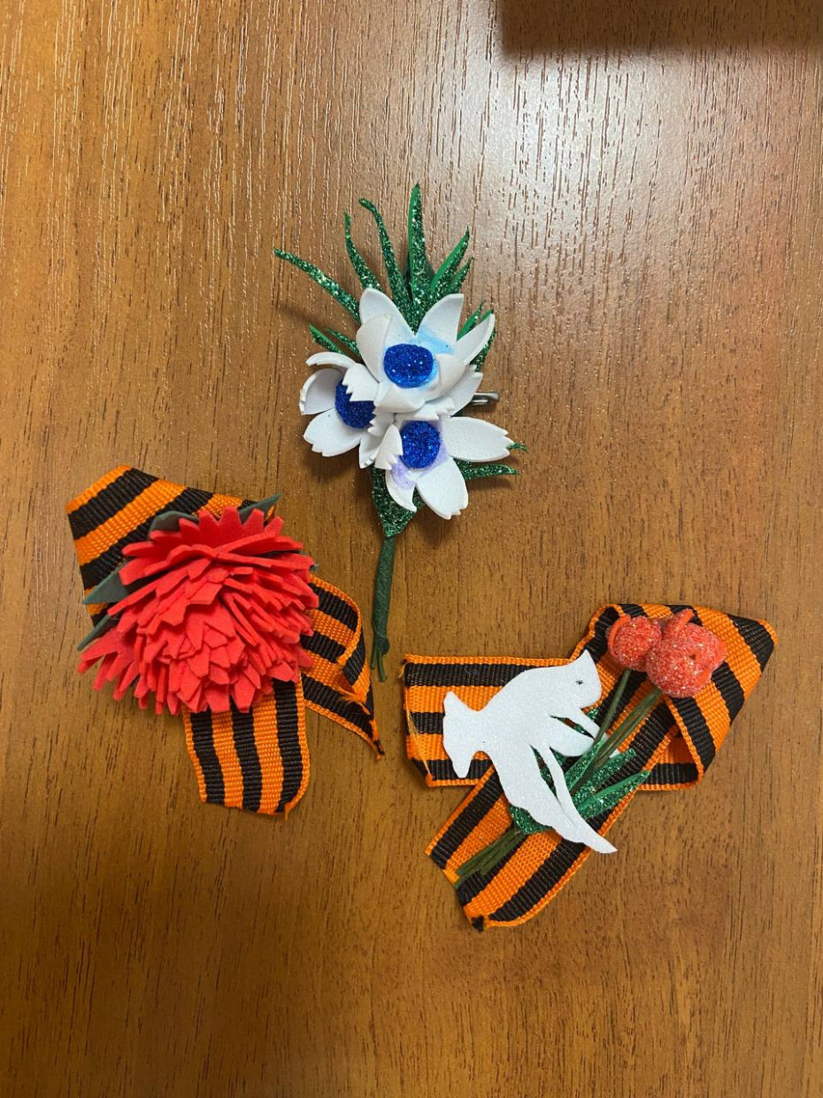 Ещё один проект – это броши с георгиевской ленточкой, разработанные детьми ко Дню Победы. Они сами придумали дизайн и воплотили его в разных форматах: с гвоздикой или голубем – символом мира. Эти значки мы будем раздавать в школе и прохожим на улице в рамках акции 9 Мая. Это тоже результат социального предпринимательства в школе.