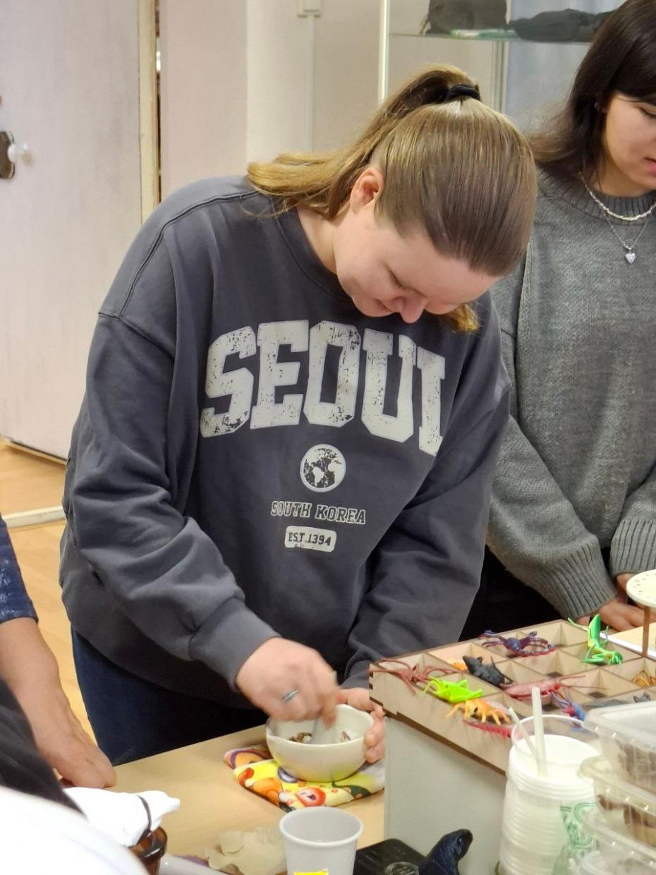 В музее ребята узнали, что истоки фармации кроются в самой природе: первые лекарства человечество создавало из растений, кореньев и, как ни удивительно, насекомых. Марина Николаевна предложила школьникам самостоятельно приготовить порошок по старинному рецепту. Для этого в ступах они смешали сахар и чёрных тараканов. А сделать это оказалось нелегко – пришлось приложить физические усилия и упорство. Так, спустя 10 минут был готов порошок, который еще в прошлом веке использовался как мочегонное средство.