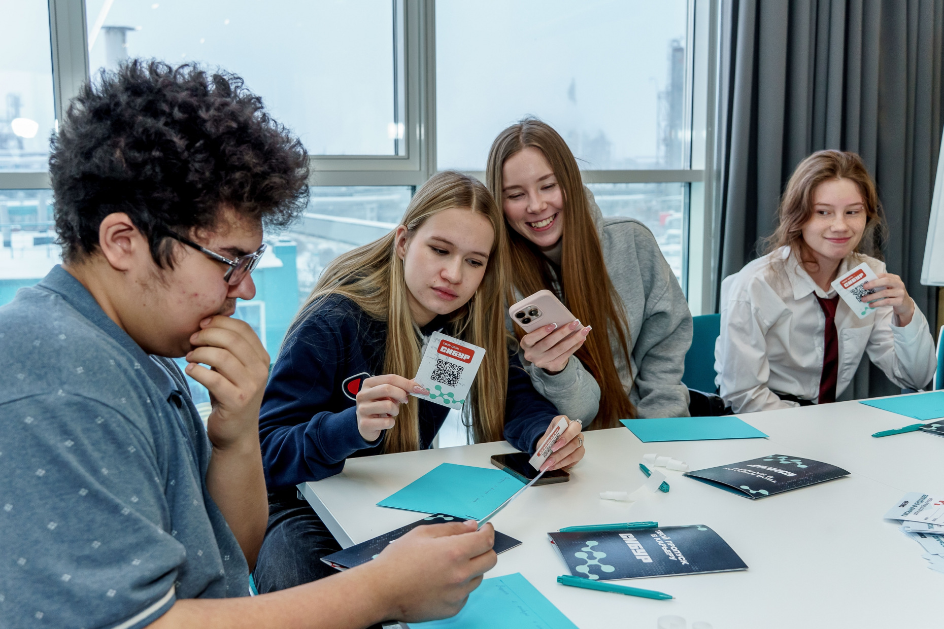 Ребят ждали пять станций: «Тайны полимеров», «ДНК СИБУРа», «Безопасность без компромиссов», «Карьерное таро» и «Факт или фейк». Формат станций позволял школьникам не просто слушать, а действовать: выполнять задания, разбираться с трендами в области нефтехимии, графически изображать ценности команды и даже писать письма в собственное будущее.