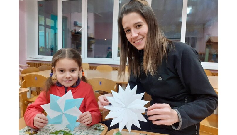 Елена Георгиевна рассказывает о своих мероприятиях: спортивно-музыкальные праздники, соревнования, военно-спортивная игра «Зарница». Популярными стали мастер-классы: «Зарядка для ума» — совместный с психологом комплекс сенсомоторных упражнений, «Тёплые ладошки» — знакомство с играми пальчиковой гимнастики.