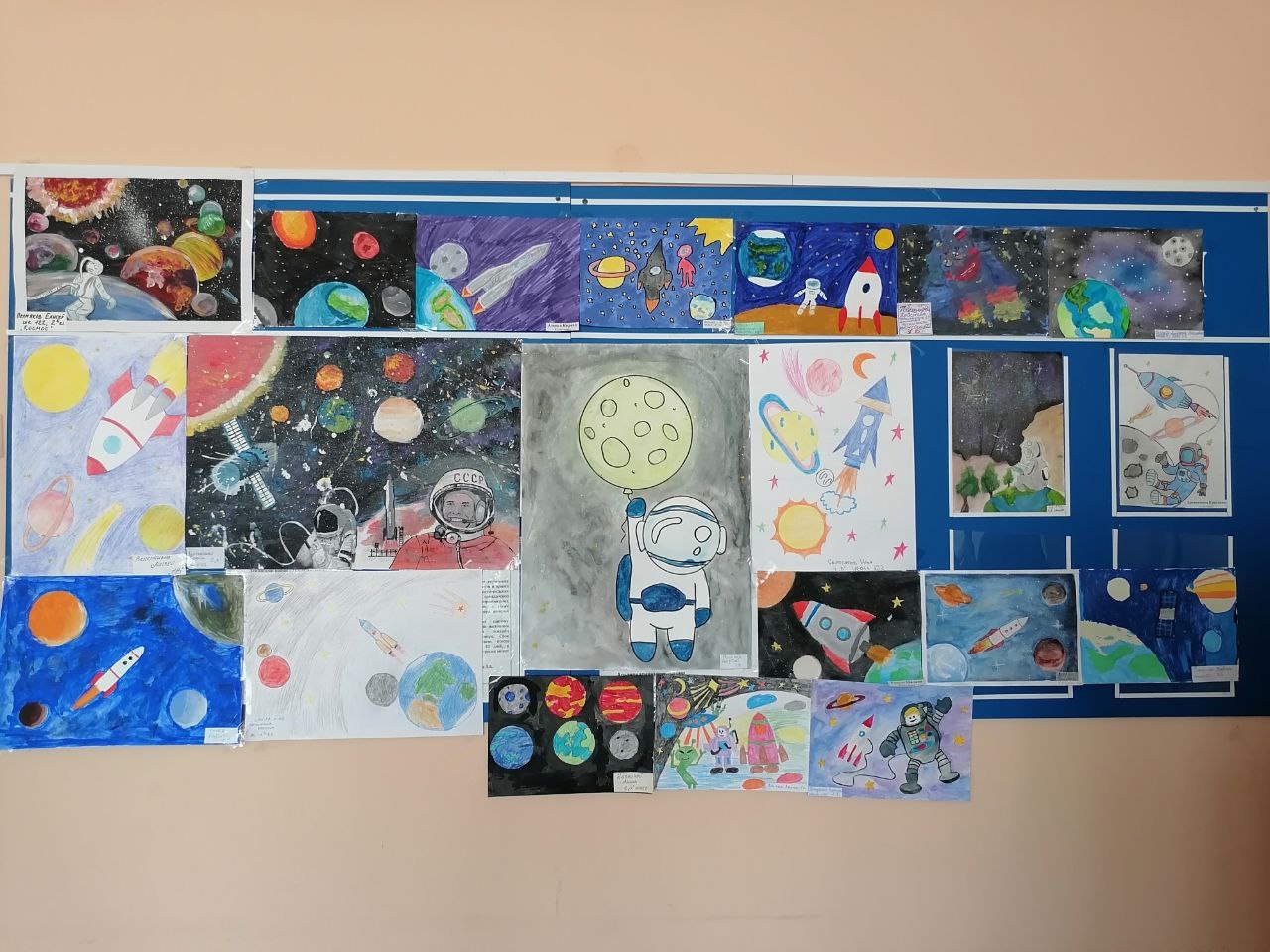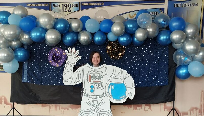 В преддверии Дня космонавтики в нашей № 122 школе на 2-м этаже около учительской организовали фотозону, где каждый желающий мог сделать снимок в образекосмонавта в открытом космосе. Ну, а в самой учительской проходила выставка – конкурс работ к 12 апреля.Более 100 творческих проектов подготовили наши ребята из начальной школы, среди которых, например, были рисунки и поделки. Подготовка ко Дню космонавтики велась не только на уроках изобразительного искусства и труда, но и на информатике: старшие ученики, работая в графических редакторах,создавали к празднику индивидуальные работы.