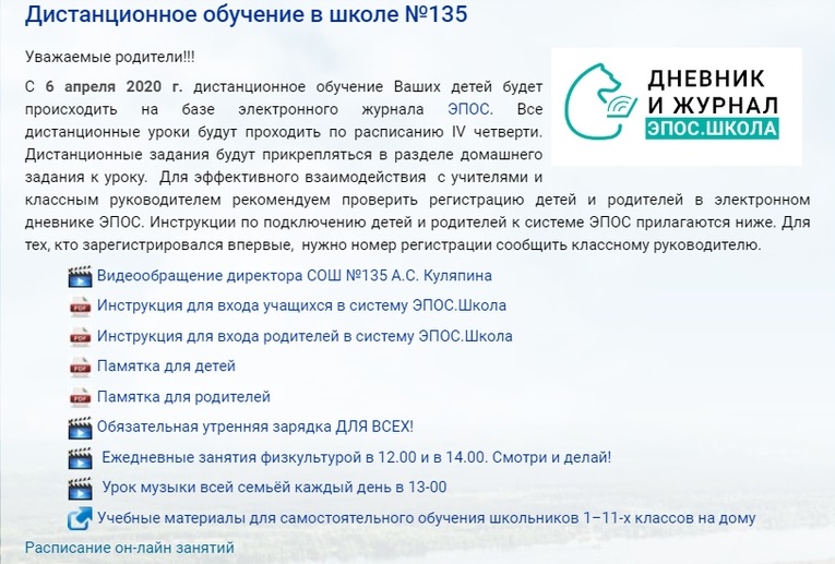 Там есть моё видеообращение к ученикам, памятки для ребят и для родителей, учебные материалы по каждому предмету, а ещё вкладка с обязательной утренней зарядкой для всех.